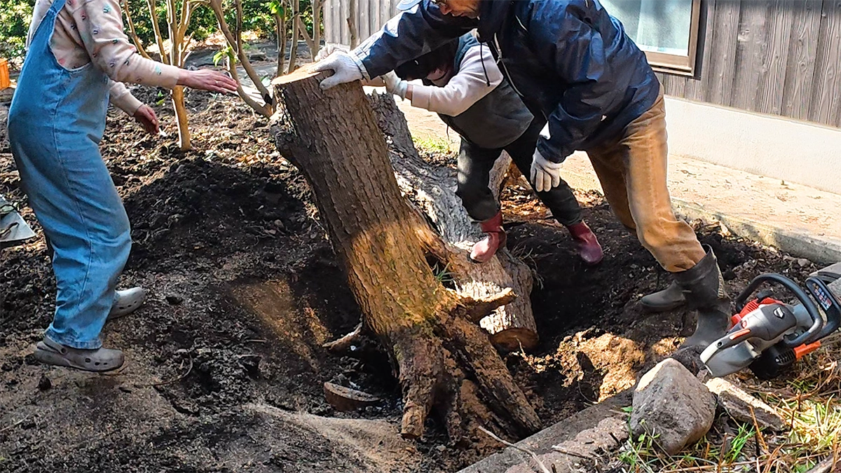 庭の松の木はシロアリに食われていて、ご近所さんの助けを借りてチェーンソーで伐採しました。